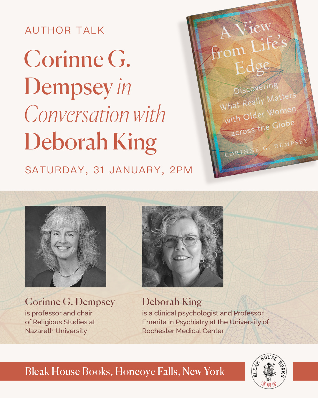 On Saturday, January 31st, we welcome writer, scholar of religion and Nazareth College professor, Dr. Corinne Dempsey, to Bleak House Books. Corinne will be joined by Dr. Deborah King, professor emerita of psychiatry for the University of Rochester Medical Center.